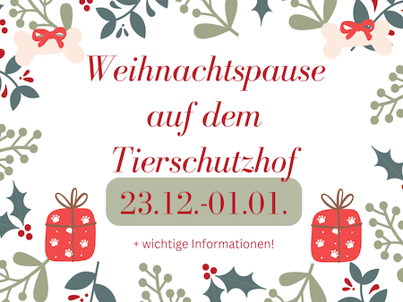 Vom 23. Dezember bis einschließlich 1. Januar 2026 gönnt sich unser Tierheim eine kleine Weihnachtspause. In diesen Tagen möchten wir ganz für unsere tierischen Bewohner da sein – ihnen Nähe, Ruhe und all die Aufmerksamkeit schenken, die sie besonders zu Weihnachten und zum Jahresende verdienen. ❤️🐾 Aus diesem Grund bleibt das Tierheim für unsere Besucher in diesem Zeitraum geschlossen.